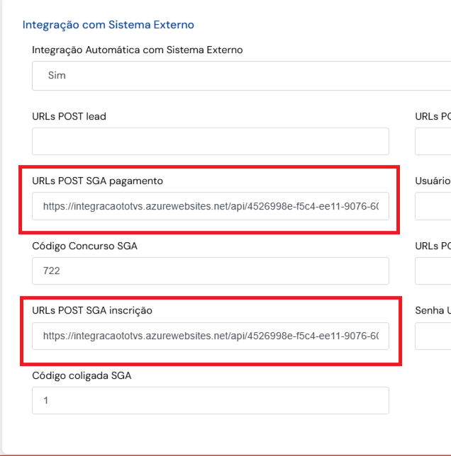 URLs POST SGA pagamento: https://integracaototvs.azurewebsites.net/api/Id de Organização/InscricoesCandidatos/IntegrarPagamento