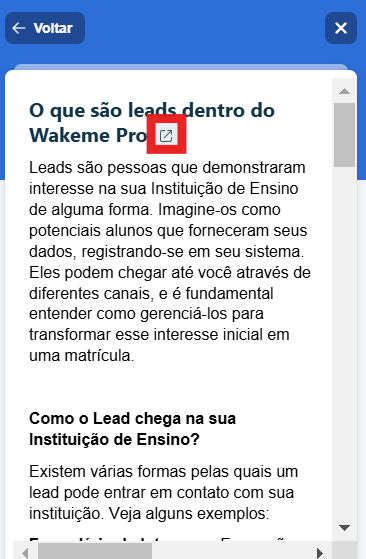 Os artigos são exibidos no canto da tela, permitindo que você continue navegando no Wakeme PRO. Caso prefira, é possível clicar no ícone ao lado do título do artigo para abri-lo em outra aba e visualizar o conteúdo de forma ampliada.