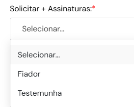 Solicitar + assinaturas → Marque entre Fiador e Testemunha, para ser possível definir participantes adicionais do contrato, conforme a regra do seu processo seletivo.