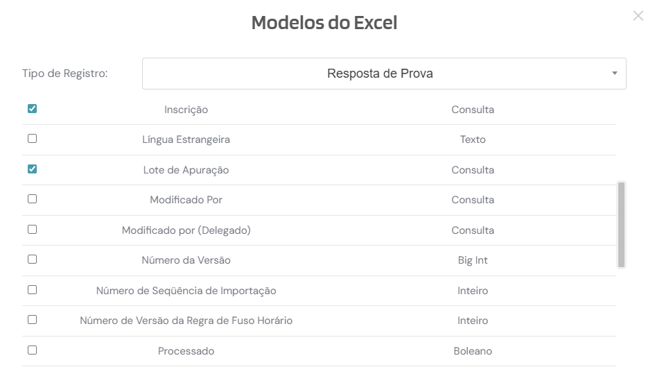 Na lista de modelos, selecione Resposta de Prova. O modelo já vem com os campos padrão marcados, sendo eles “Inscrição”, “Lote de Apuração”, “Prova” e “Respostas”. Caso você deseje adicionar mais algum campo, basta marcá-lo antes de exportar o modelo.