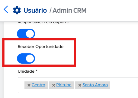 A configuração dos usuários que receberão oportunidades deverá ser realizada dentro do cadastro do usuário;