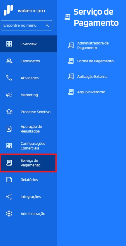 No menu lateral do Wakeme PRO, localize a opção Serviço de Pagamento, posicionada acima de Relatórios.
