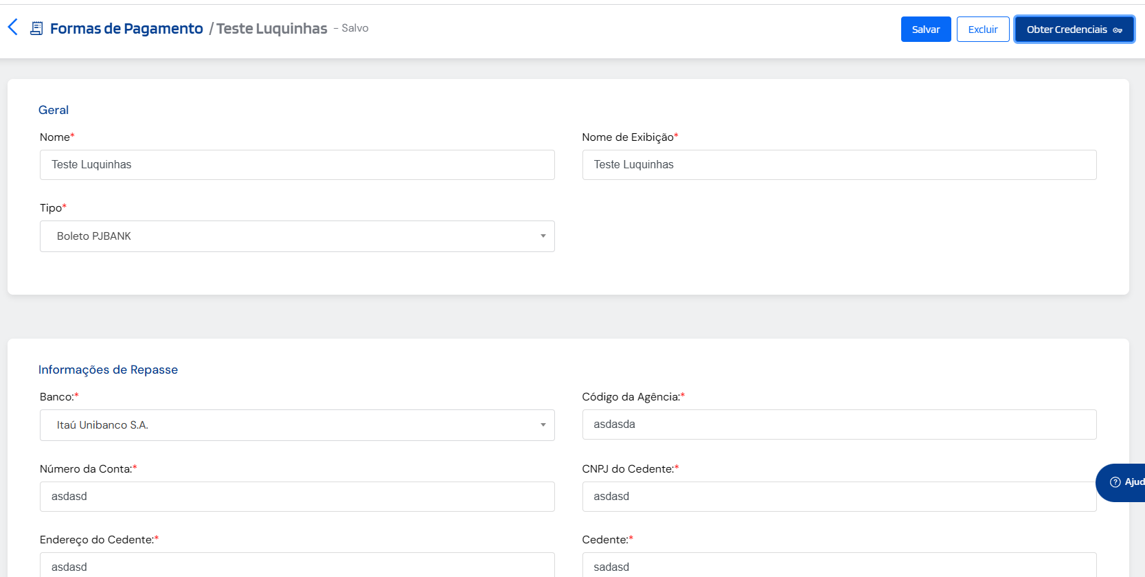 A tela conta com a ação “Obter Credenciais”, que automatiza a integração.