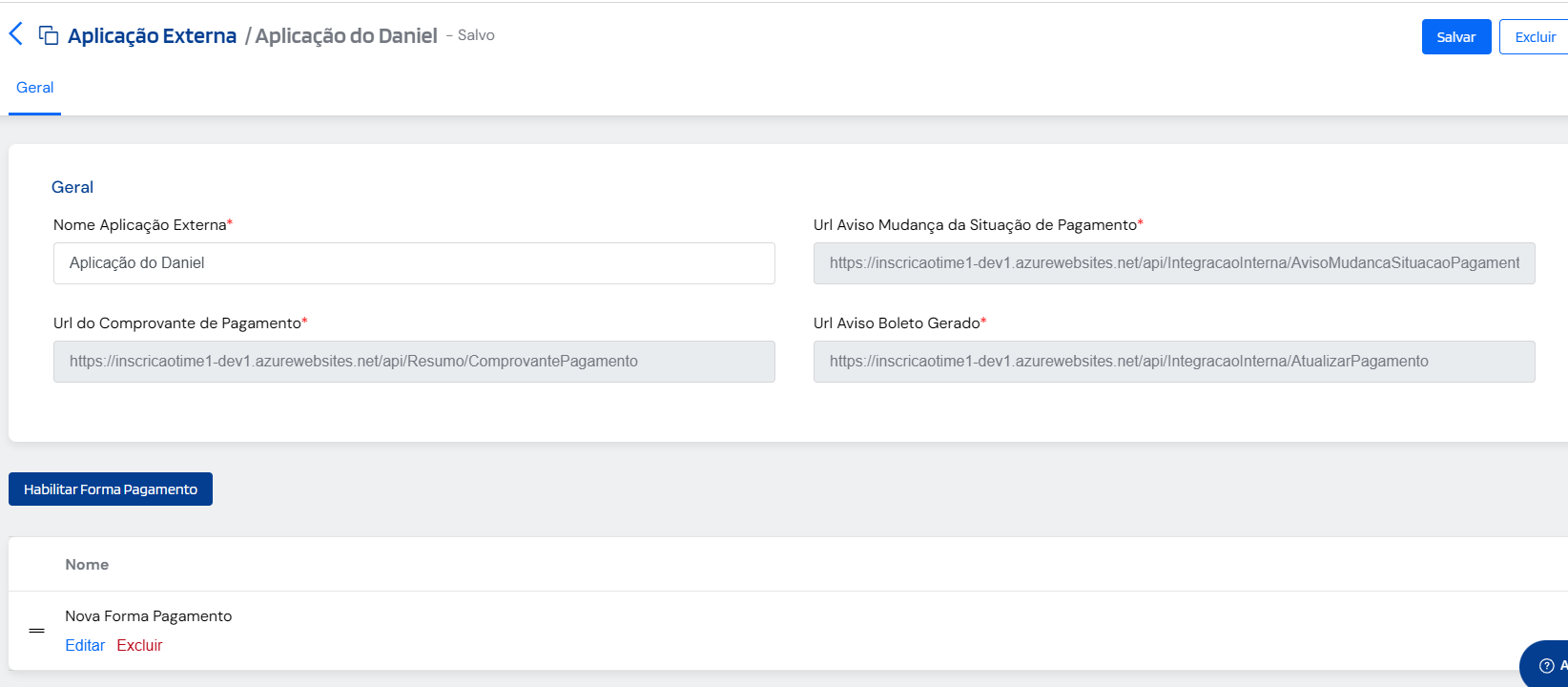A tela Aplicação Externa é responsável pela configuração da integração com sistemas externos.