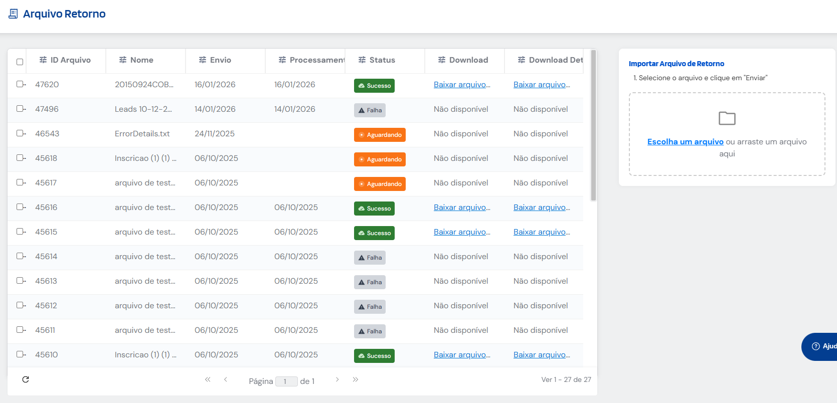 A tela Arquivo Retorno permite acompanhar e gerenciar os arquivos de retorno relacionados aos pagamentos.